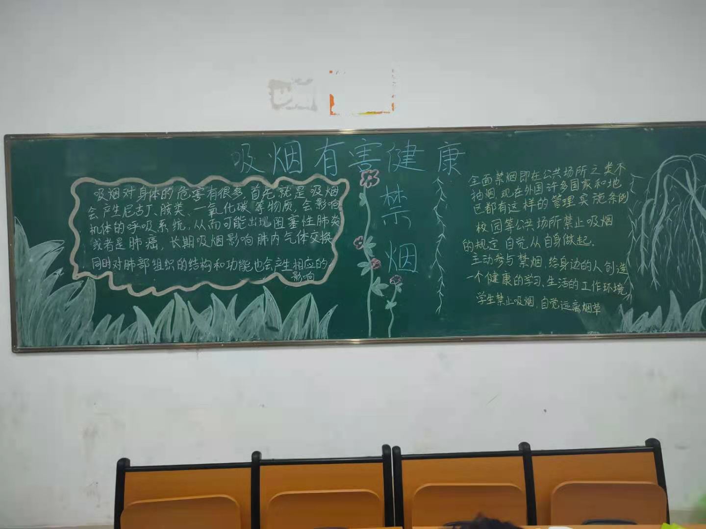 会前,各班级出了一期以“禁烟”为主题的板报进行宣传教育,营造浓厚的“禁烟”氛围。