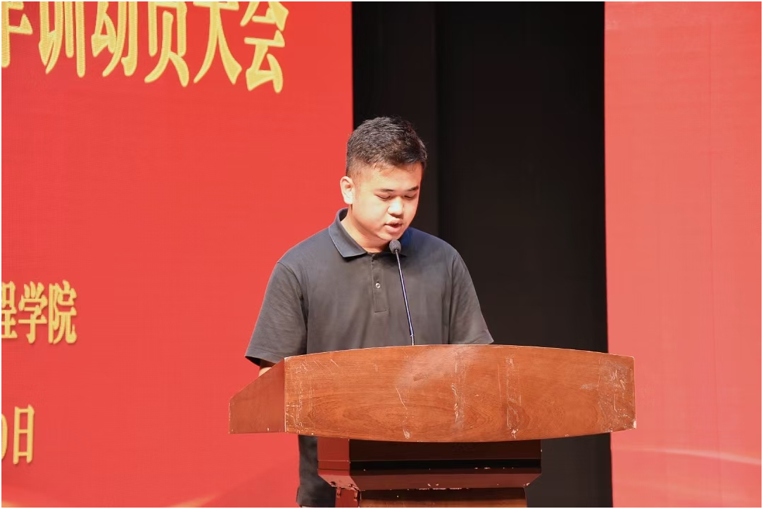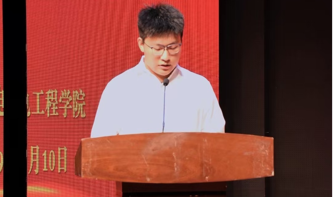 老生代表23级电气自动化技术1班张卓麟对学弟学妹表示欢迎,并结合自身一年的经历表示学校是一个展示自我的大舞台,希望学弟学妹能珍惜现在,不惧怕失败,为理想努力奋斗。